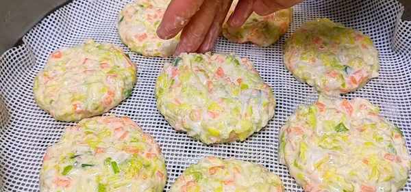 5、攪拌均勻之後,手上抹點油,取一點食材整理成圓形小餅,放在蒸屜中,全部放好之後,水開上鍋蒸,大火蒸八分鐘,這樣蒸出來的小餅才會特別的柔軟又好吃。