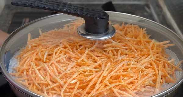 3、蒸屜上鋪上一層絨佈,把胡蘿卜絲放在上面,攤的均勻一些,開大火燒開,蒸上兩分鐘。