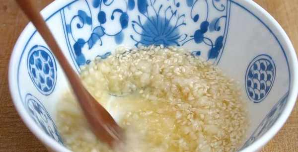 4、幾瓣大蒜拍扁,再剁成蒜末,裝入小碗裡,加一勺白芝麻,淋上燒好的熱油,激發出香味。然後加點鹽,少一點雞精,攪拌均勻就行瞭。