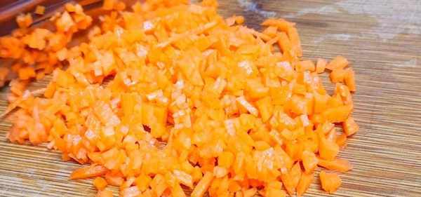 準備一根胡蘿卜,去皮之後切成胡蘿卜丁,裝入盤中備用。