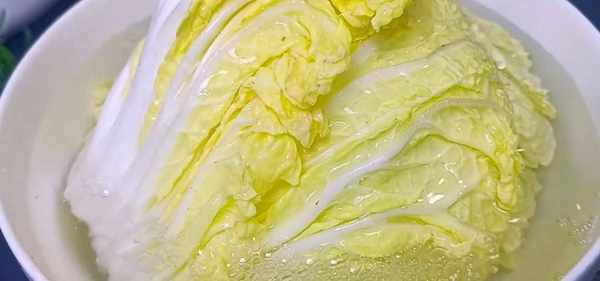 1、首先準備一些白菜葉子,放入大碗中,加入一勺食鹽,倒入適量的清水,讓白菜在鹽水裡面浸泡五分鐘,食鹽具有消陷害菌的作用。