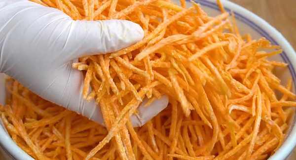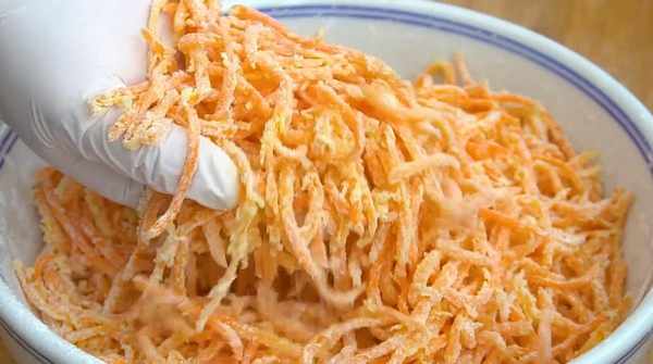 2、翻拌均勻以後,往裡面加入幾勺面粉,戴上手套,用手抓拌均勻,使每根胡蘿卜都包裹上一層面粉,根根分明就可以瞭。