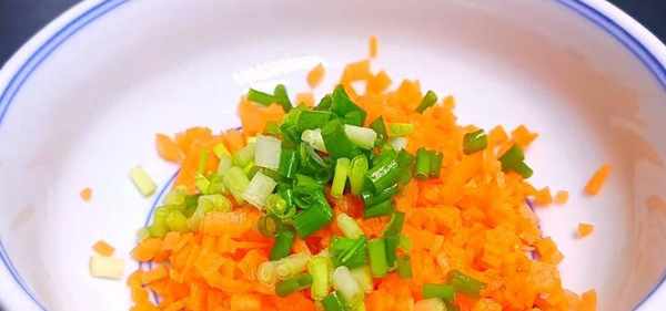 3、再準備一把小蔥,切成蔥花,切完之後和胡蘿卜丁放在一起。
