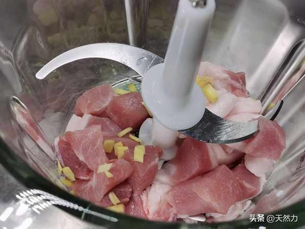 2、在剁肉餡之前就要把肉清洗幹凈,洗好後切成小塊,再準備1小塊生薑,先切薄片,再切細絲,最後切成薑末,我這個薑末切太大瞭,這是錯誤的示范。把切好的肉和薑末一起放料理機中絞打成肉沫,打的時候不要打太細,要稍微有點顆粒感,和做餃子餡的肉餡大小即可。沒有料理機的就用刀先把肉切片,再切成條,然後切成小肉丁,最後再用刀剁成肉沫,剁的時候把薑末加進去一起剁。好像用刀剁出來的肉末要比機器絞出來的味更鮮美,口感更好。