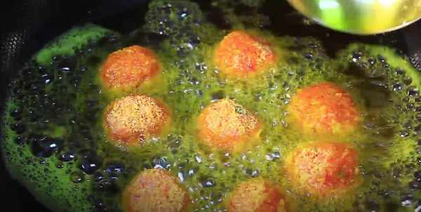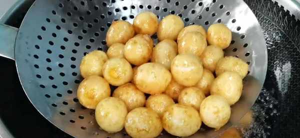 5、等油溫達到6成熱的時候,將鵪鶉蛋肉丸一個個放進去,開小火慢炸,炸至表面金黃酥脆就可以撈出來瞭。