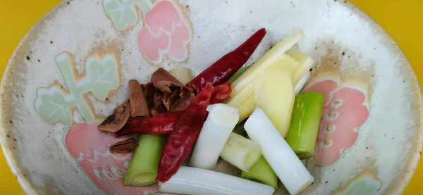 3、趁這個時間,我們可以準備一些料頭,先是切上一點蔥段,再切一點薑片,切好裝入碗中,接著在碗裡邊放兩個幹辣椒,一個八角掰成小塊,再來點桂皮即可。