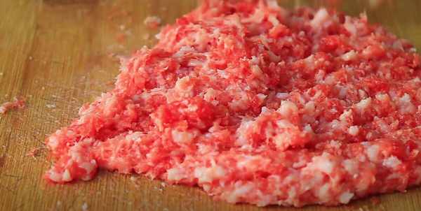 2、把從菜市場買回來的肉餡,給它放在案板上,重新再剁一下,爭取把它剁得更細膩一點,這樣吃起來口感會更香。