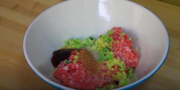 3、把剁好的肉餡放碗裡,往裡加入生薑末和蔥末,然後放入一些料酒、精鹽,再來一點蠔油,少許的五香粉,接著給它攪拌均勻,給它醃制5分鐘。