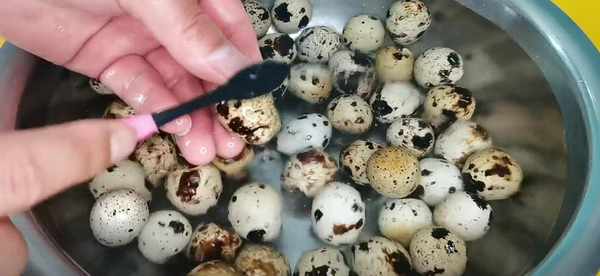 1、首先準備一些鵪鶉蛋,給它放入水中,然後用刷子仔細給它刷洗幹凈,雖然說不吃蛋殼,但還是要洗幹凈的。