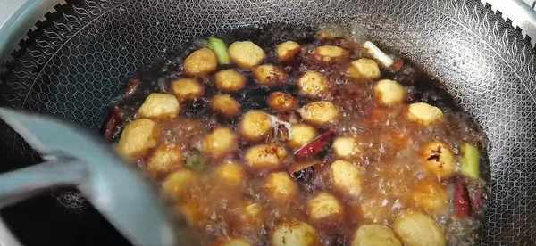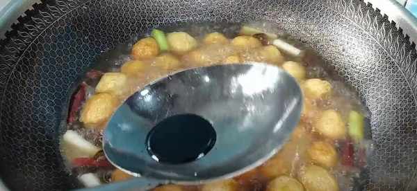 6、水開之後,再放入炸好的鵪鶉蛋,看著這個顏色有點淡,那就再來一點老抽上色,用中火給它煮上六七分鐘,讓鵪鶉蛋入味。