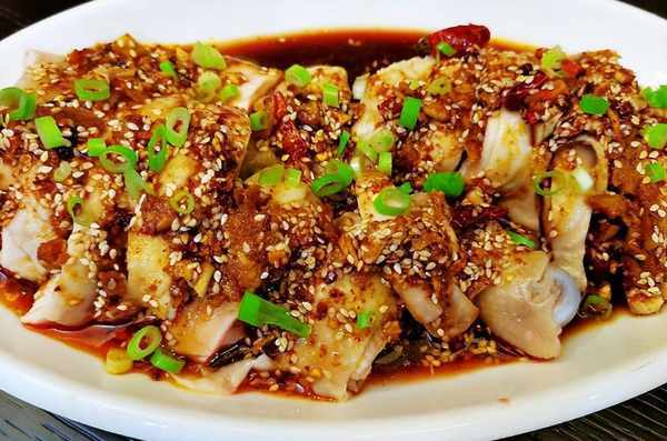 1、雞身材肉焯水後切成絲,用鹽、花椒粉、生抽、麻油醃制10分鐘;