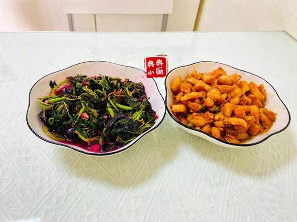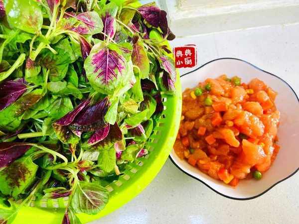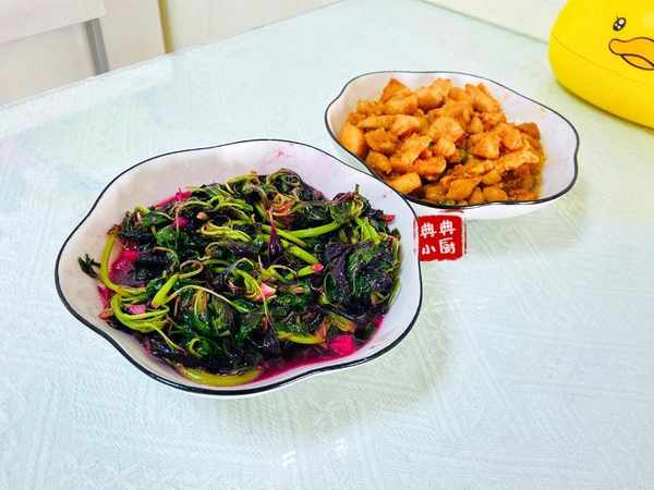 蒜泥莧菜。這道菜就超簡單瞭,莧菜去掉根部泡水裡再沖洗幹凈,起油鍋,下蒜泥炒出香味,再把莧菜倒進去,翻炒幾個,莧菜炒一會兒就會出水瞭,等莧菜變軟之後加鹽提味,就可以出鍋瞭。我出鍋之前還會加一丟丟豬油,非常香,夏天炒素菜或者炒素湯的時候我都會另外加一點豬油來添香的。