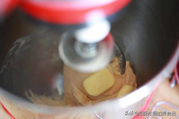 1、蛋液,牛奶放入廚師機面缸中,再放入,細砂糖,鹽,奶粉,和高筋面粉,最後放入幹酵母,攪打到面團成團,之後加入軟化的黃油,繼續和面到,面團可以拉出比較結實的美顏。