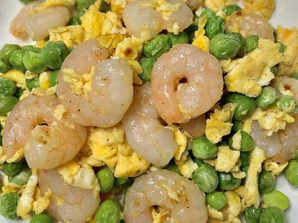 4.炒至蝦仁變色後,倒入雞蛋液滑熟,接著倒入豌豆一起翻炒均勻,淋入少量生抽提鮮,繼續翻炒均勻入味,即可出鍋開吃。