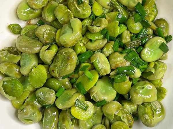 1.蠶豆剝好後,清洗幹凈,然後起鍋燒水,水燒開以後,加入適量的食鹽和花生油調味提鮮,接著放入蠶豆焯煮五分鐘焯熟,再撈出瀝幹水分備用。