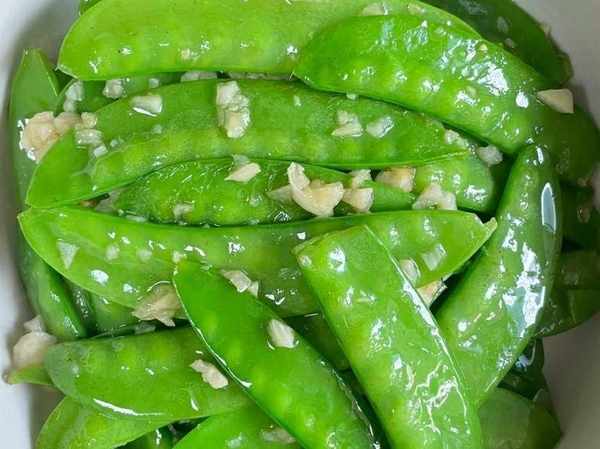 2.切好蒜末,然後熱鍋燒油,油熱以後,放入蒜末爆香,接著倒入焯好的荷蘭豆大火翻炒均勻。