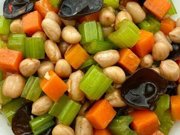 食材準備:花生、芹菜、木耳、胡蘿卜、八角、香葉、蒜末、幹辣椒、花椒粉。