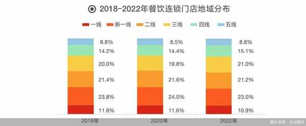 面對連鎖化率和規模化的漲幅,下沉市場成為瞭提升市場容量的關鍵,下沉市場連鎖品牌門店的比重逐漸增加。美團數據顯示,在2018-2022年餐飲連鎖門店地域分佈中,一線、新一線、二線城市的門店數分佈比例整體略有收縮的趨勢,三線、四線、五線城市的連鎖門店分佈提升顯著,五年間,連鎖門店在三線和四線城市的分佈分別提升瞭約1%。
