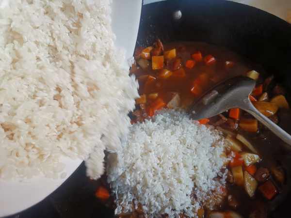 第八步:倒入淘洗好的大米,加入一大杯水,炒勻大火燒開。