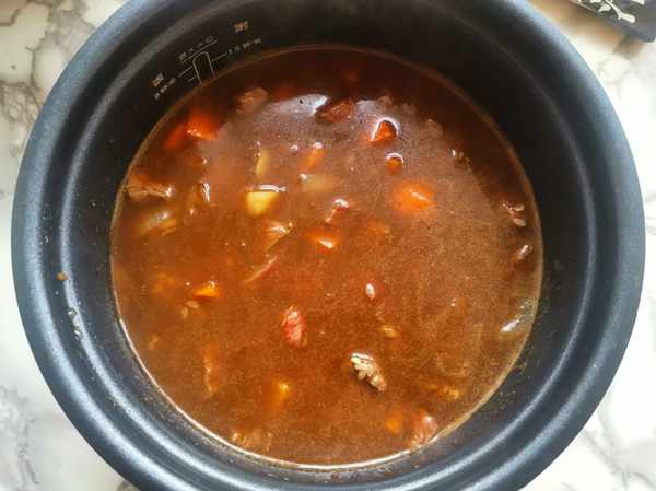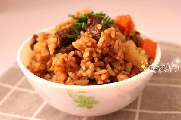 所用資料:大米500克,牛肉塊,胡蘿蔔1個,洋葱半個,洋芋2個,黃肖氏醬香燒汁1包,小葱末少許。