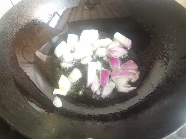 第三步:鐵鍋燒熱,放上適量的花生油,放入洋葱爆香。