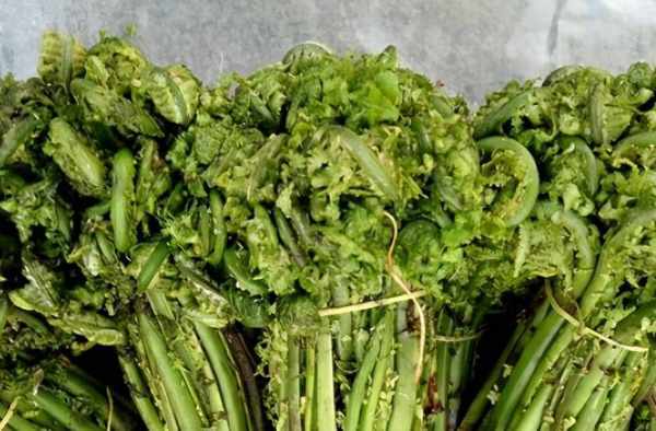 “蕨處處山中有之。二三月生芽,拳曲狀如小兒拳。其莖嫩時采取,以灰湯煮去涎滑,曬幹作蔬,味甘滑,亦可醋食。”