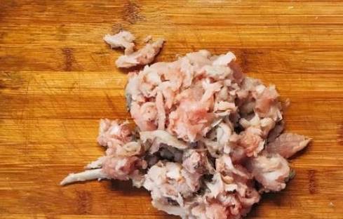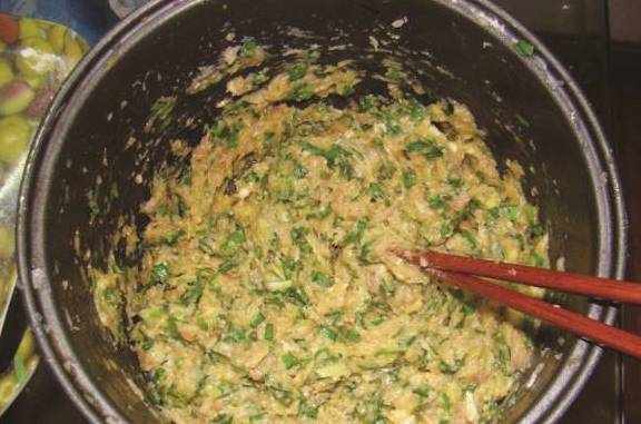 6、攪餡調味。把剁好的魚肉裝進盆裡,加一個生雞蛋和少許水調和好,如果魚肉太稀的話就需要加一點鹽,魚肉太黏稠的話要加水。用筷子調和時,沿著順時針的方向攪動,否則容易“懈”。給魚肉調味時依個人口味可添加花椒粉、醬油等,還可以加糖、醋或料酒去除腥味。調好的魚肉裡再放進一些韭菜末。