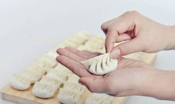 7、拿出和好的面團,開始包餃子。包好的餃子最好立馬就煮,或者馬上凍起來。肉餡的水分含量很大,放久瞭容易變塌。
