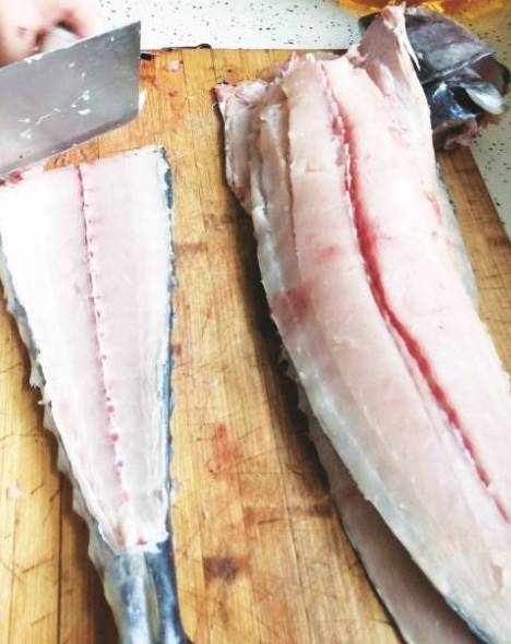 2、將處理幹凈的鮁魚沿魚身中軸線橫切一刀,在頭部附近豎切一刀,把魚身分成兩半。取出兩片魚身後,刮出魚蓉。刮魚蓉時要註意把大刺挑出後再刮,避免把魚刺和魚蓉混在一起。
