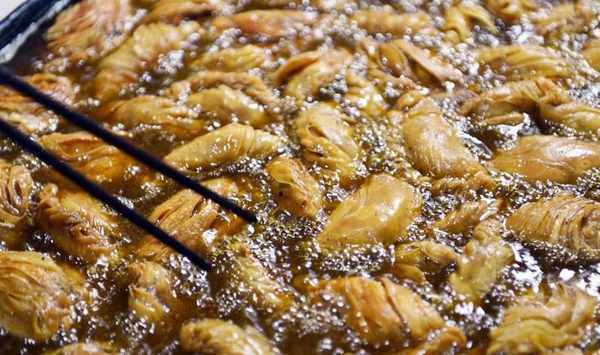 這傢百年老店制作的酥餃,屬於油炸類茶後品味小吃,外表焦黃酥脆,十八道花邊修飾,寓意福祿壽喜等十八個世俗生活中的美好祝願。超大的油鍋裡,酥餃金黃誘人,香溢滿屋。