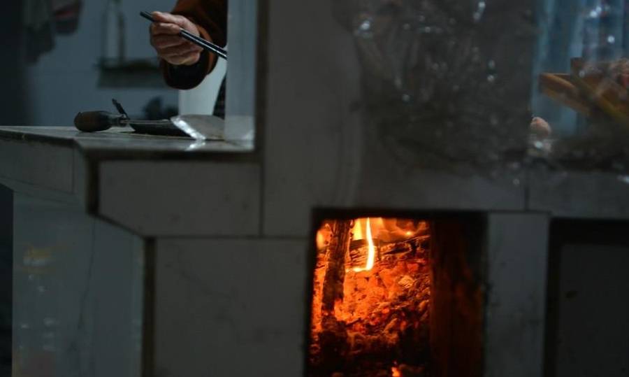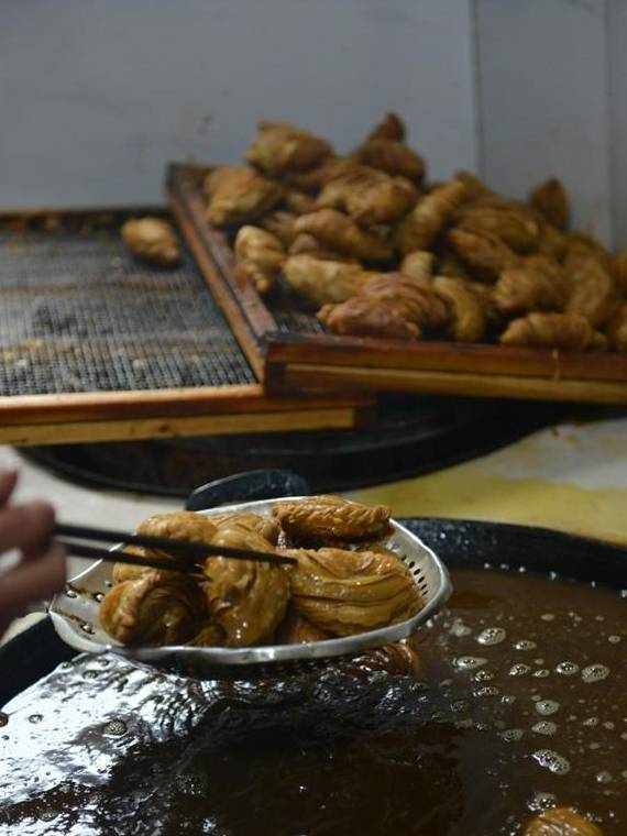 圖為店裡師傅正用傳統鍋灶在炸制酥餃。