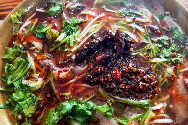 於是,在這個早上,帶著略微失望的情緒走進瞭一傢米線小店。我和操著帶本地口音川話的老板聊瞭下,點瞭一份米線。本以為到瞭這裡,牛羊肉普遍,端上來的碗中應該多幾分羊肉之類的,卻在一碗米線中看見鋪瞭一層新鮮未斷生的薄荷新葉,額,有點無從適口。