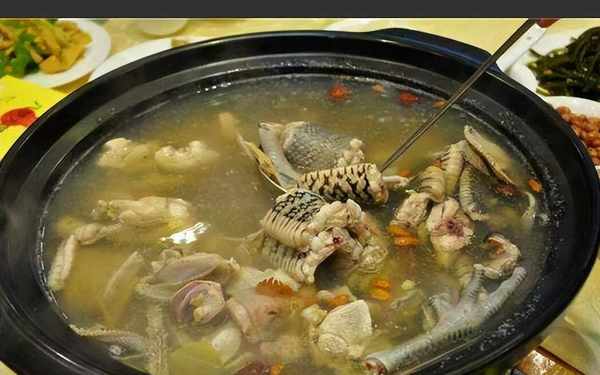 龍鳳湯是南平地區一道獨特的湯品,不僅氣質獨特,而且營養豐富,制作方法也很特別。首先,將蛇宰殺,去皮,去頭尾,然後把蛇肉從背部切成一寸長的段,再將這些蛇肉拼成整條蛇,蛇腹彼此相連,盤好。接下來,把乳鴿去毛,剖腹去內臟,洗凈,與蛇肉一起放入沸水中氽燙。
