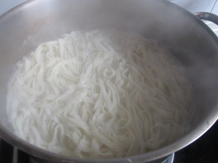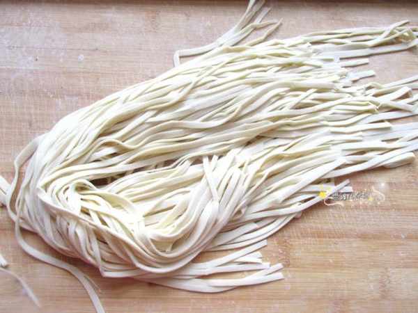 第六步:擀好的麵條直接放在案板上就可以,然後煮面。在煮面的同時可以把配菜或者配湯做好。