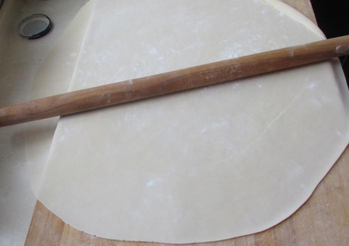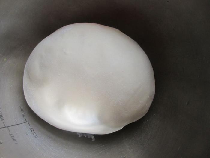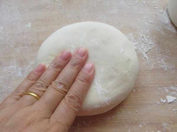 第二步:麵團揉好以後,放到面板上,撒上手粉防粘,按扁用大擀麵杖擀開。