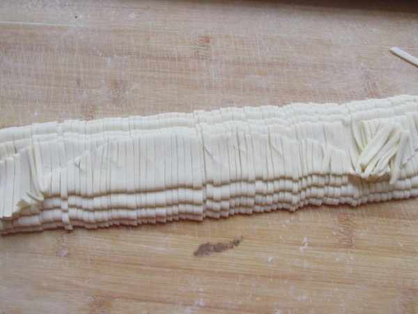第四步:把面皮上撒上乾麵粉防粘,然後折疊,用刀切成想要的寬度,寬窄大約都一致就可以。