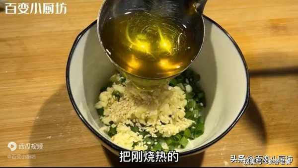 然後把大蒜切成蒜末,切的越碎越好。也收入碗中備用,加一點熟的白芝麻。把剛燒熱的熱油澆進來,利用熱油可以很好的激發出蔥花還有蒜末的香氣,並且可以讓裡面的蔥花顏色看起來更加的翠綠不變色。