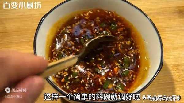 接著加一勺鹽,生抽,一點點香醋,香油,胡椒粉,雞精,小半勺白糖,自傢秘制的油潑辣子,多放兩勺比較香,接著用勺子攪拌攪拌,攪拌均勻,這樣一個簡單的料碗就調好瞭。