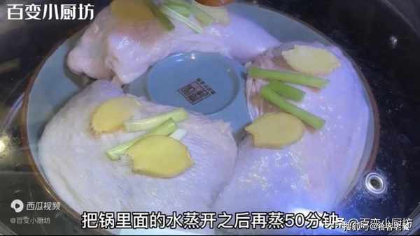我們先放在一旁備用,這個時候鍋裡面的雞腿也已經完全蒸好,解開鍋蓋,然後把裡面的蔥段、生薑片煎出來。