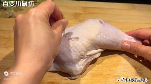 洗好的雞腿放在菜板上,再找一根牙簽,依次在雞腿上面插上一些小孔。