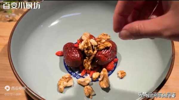 接下來準備三顆紅棗,一小把枸杞,把紅棗和枸杞淘洗幹凈,洗紅棗和枸杞的時候直接用清水洗是洗不幹凈的,我們一般要往裡面加一點食用純堿或者是小蘇打,是因為小蘇打或者是純堿具有很好的清潔作用,而且還有一定的吸附性,而枸杞和紅棗表面又有許多的褶子,剛好適合這種洗法。