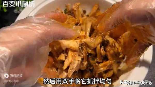 而且這個雞腿肉比紅燒和爆炒都還要香,三個雞腿就撕瞭滿滿一大盆,這個時候隻需要把我們剛才調好的料汁倒進來,然後用雙手將它抓拌均勻,讓每一塊雞肉上面都充分的裹上料汁。