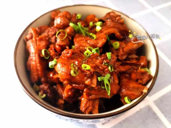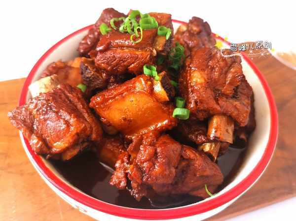 4,改成小火慢慢的燉大約40分鐘,湯汁已經很少了,排骨也熟透了,就可以直接關火出鍋,裝盤以後,撒上小葱末稍微點綴即可。