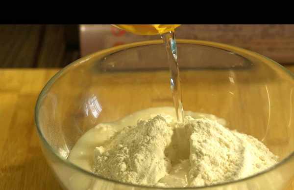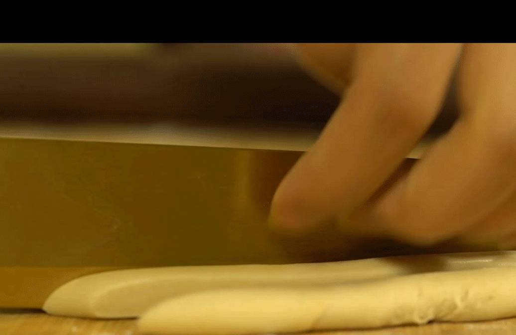 1,面粉中加水揉成面團,餳發半小時後拿出,將面團搟成半厘米厚的面片