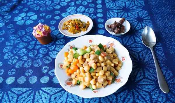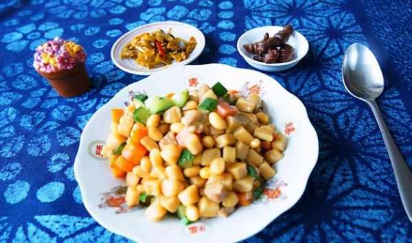 4,加入適量清水將黃豆煮熟,加醬油和煮好的面疙瘩翻炒均勻,出鍋時加入黃瓜丁適當翻炒即可