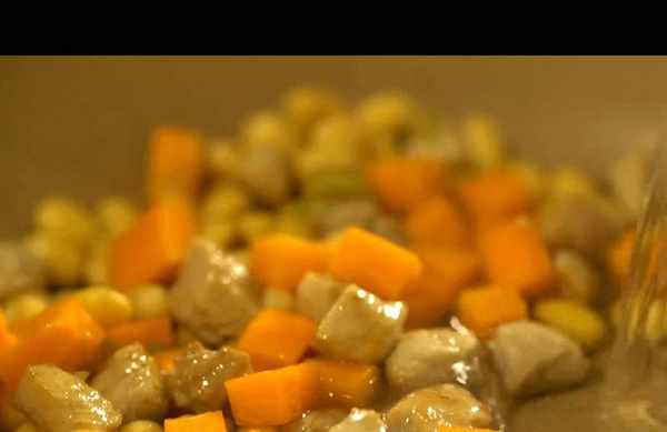 3,鍋中倒入食用油,放入瘦肉丁炒至變色,放入蔥花炒香,放入黃豆和胡蘿卜丁炒勻