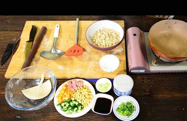 面粉200g,水100g,胡蘿卜丁50g,蔥花5g,泡發好的黃豆20g,黃瓜丁50g,瘦肉丁50g,食用油適量,醬油適量