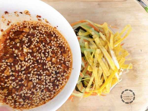 3、最後將調好的料汁淋入準備好的食材中攪拌均勻即可。