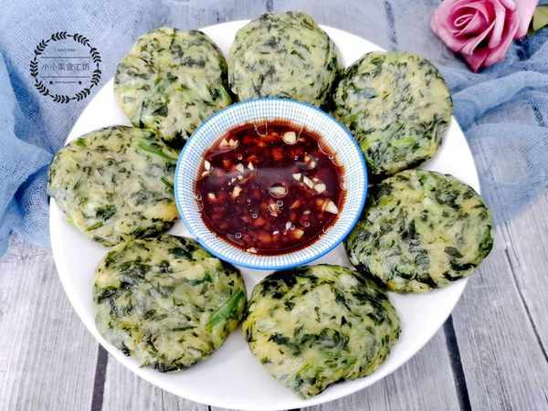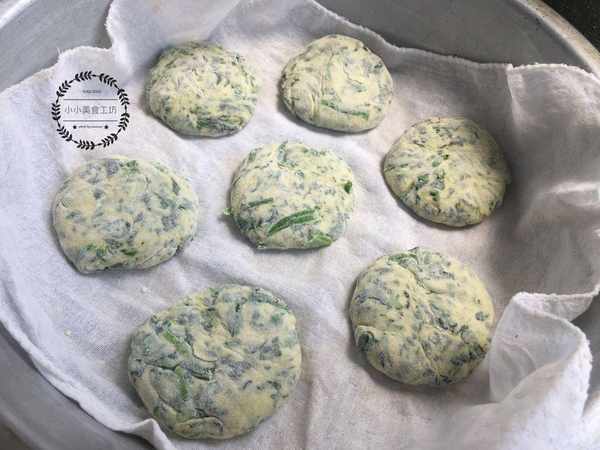 3、然後將菜團分成小面劑,按壓成小餅放入蒸屜中蒸制成熟。