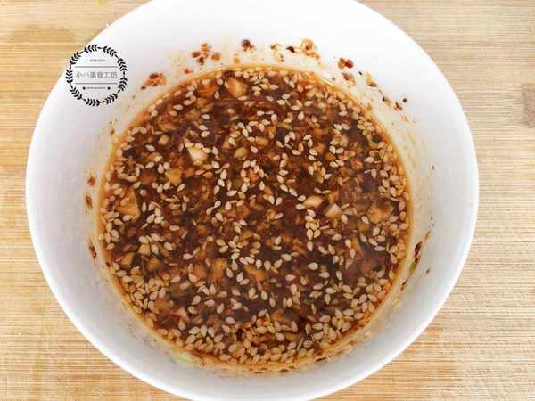 2、碗中倒入蒜末,芝麻和辣椒粉,淋入熱油激發出香味,然後加入適量生抽,香醋,食鹽和白糖調味。